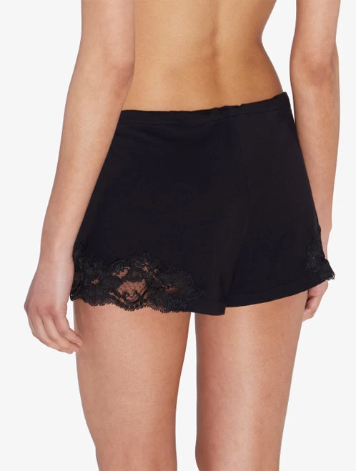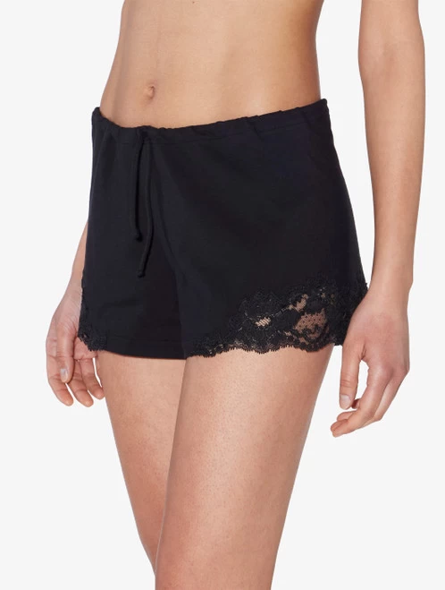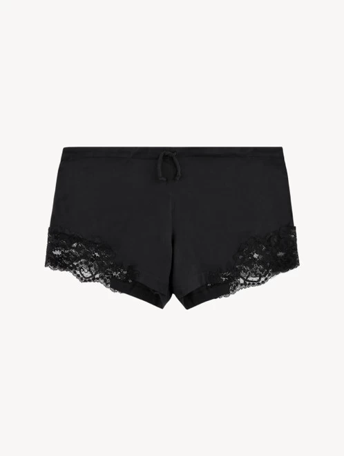 Sleep shorts in stretch cotton jersey that is delicate and thick to the touch. The result is an undergarment that is versatile, comfortable and elegant. The piece is embellished with floral stretch Leavers lace inserts.