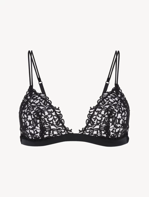 Luxurious triangle bra with macramé detailing, finished in stretch georgette silk. Made in Italy.