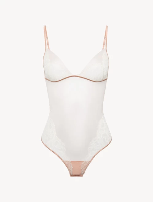 With a beauty that endures, the daring Poesia collection is as versatile as it is seductive. Combining the exquisite blooms of Leavers lace that trail across the skin with the sensual soft touch of luxuriously delicate tulle, the striking Bodysuit in a Romantic mix of Linen and Nude Rose is meticulously crafted from upcycled materials found in our Bologna atelier. Cut from thoughtfully-placed panels designed to enhance and celebrate the curves of the female form, it’s made to create a flawless silhouette.