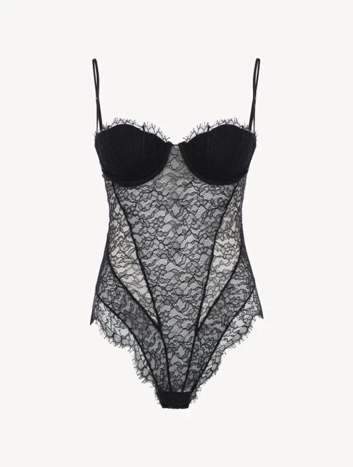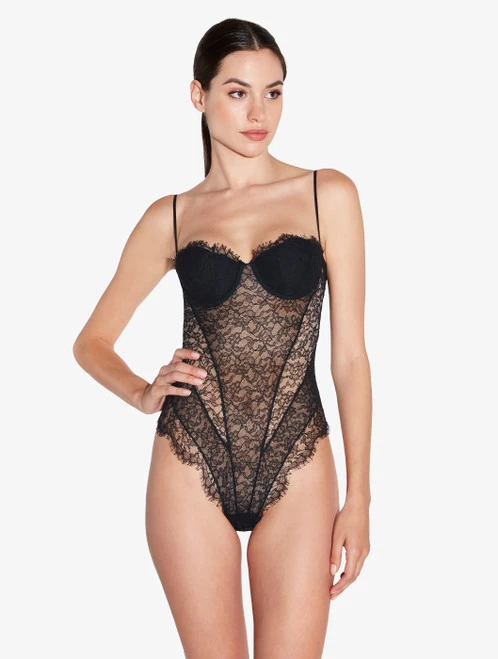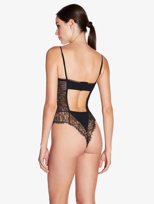 Blending the sensual sophistication of exquisite lace and the luxurious comfort of fluid silhouettes, the Spell On You collection is designed for elevated dressing, everyday. Padded and underwired for a flawless and flattering finish, the exceptional Bodysuit in Onyx has removable straps and is meticulously crafted from lace that creates a beautiful trail of winding florals across the skin. Use as the ultimate underpinning to your most empowering looks or style underneath an oversized blazer to give unexpected glimpses of what lies beneath.