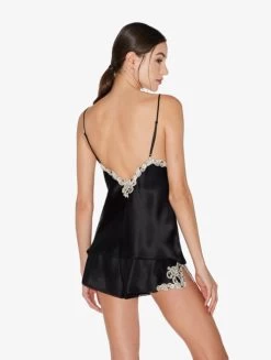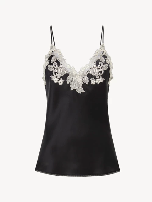 The most luxurious piece in the La Perla Maison collection features embroidered motifs on a tulle background in the same colour as the silk, hand finished with a double-frastaglio technique. Silk satin camisole embellished along the neckline by embroidery on tulle backing in the same colour silk. Finished with hand-embroidered double frastaglio embroidery. This process reproduces the effect of flowers framing the body. A modern yet elegant creation that represents the newest and most exquisite style in the La Perla Maison collection.