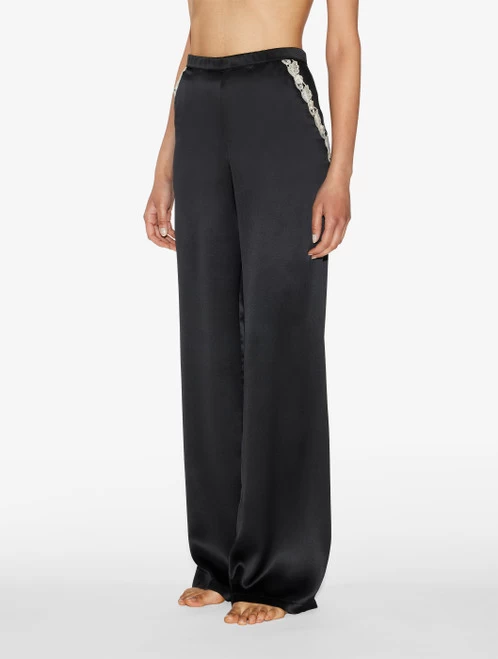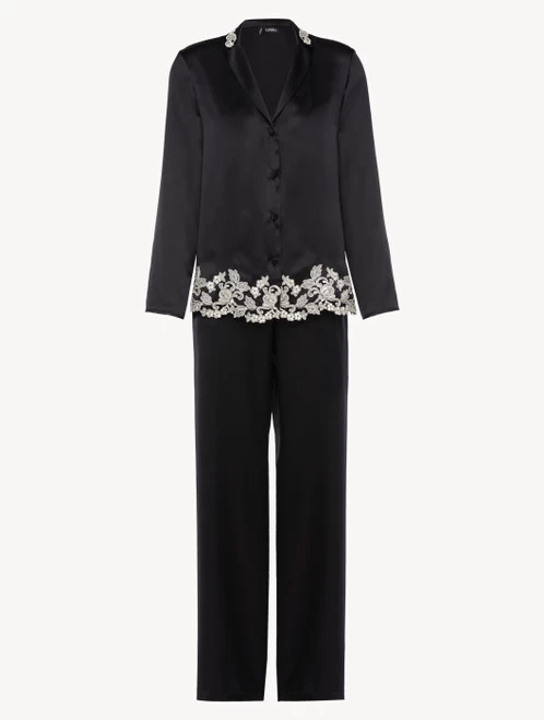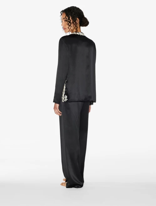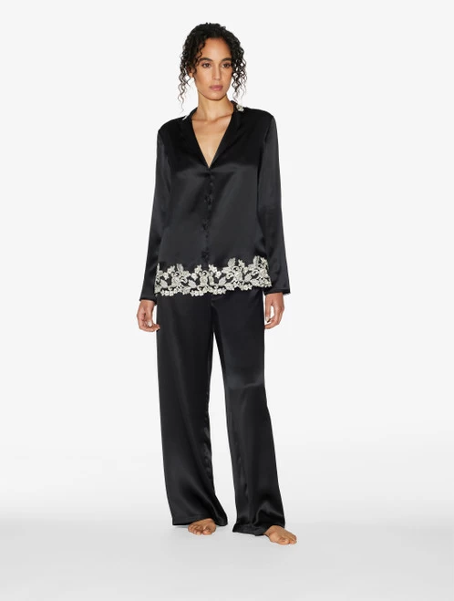 The iconic Maison collection embodies La Perla’s dedication to fine Italian craftsmanship and the most precious materials. These button-down pajamas feature embroidered motifs on a tulle background, hand finished with a double-frastaglio technique, which reproduces the effect of trailing flowers. A relaxed silhouette makes these perfect for evening wear and daytime lounging. A modern yet elegant creation that represents the newest and most exquisite style in the Maison collection.