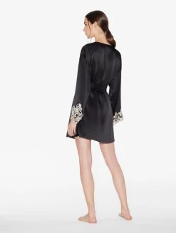 La Perla Maison captures the true spirit of its Made in Italy heritage. Defined by an antique Florentine technique of applying embroidery by hand, this unique piece can take up to two days to create. Crafted from a weightless black silk-satin, the Maison robe embodies qualities of preciousness and individuality. The elegant crossover silhouette is trimmed with handcrafted ivory frastaglio embroidery to the sleeves. A sash tie at the waist creates a sensual definition. Pair with the matching slip for a timeless look.