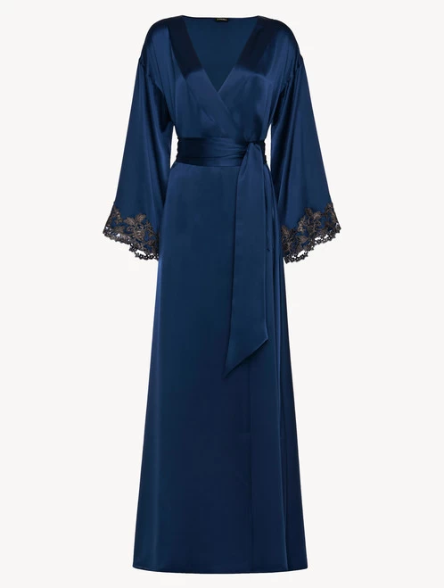 Silk satin long robe embellished with embroidery on tulle backing in the same colour silk. Finished with hand-embroidered double frastaglio embroidery. A modern yet elegant creation that represents the newest and most exquisite style in the La Perla Maison collection.