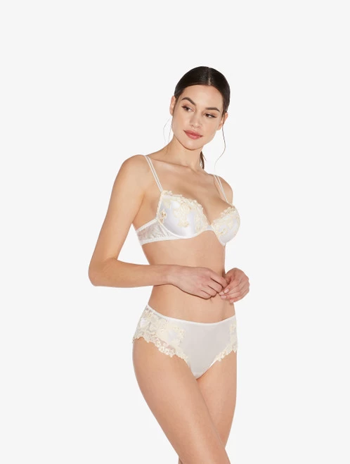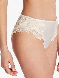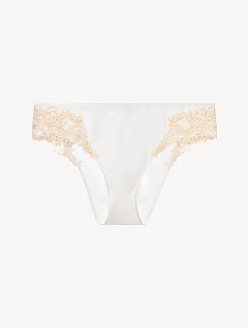The most luxurious piece in the La Perla Maison collection features embroidered motifs on a tulle background, hand finished with a double-frastaglio technique. This process reproduces the effect of flowers climbing up the body. A modern yet elegant creation that represents the newest and most exquisite style in the La Perla Maison collection. These medium briefs offer medium coverage. Made in Italy