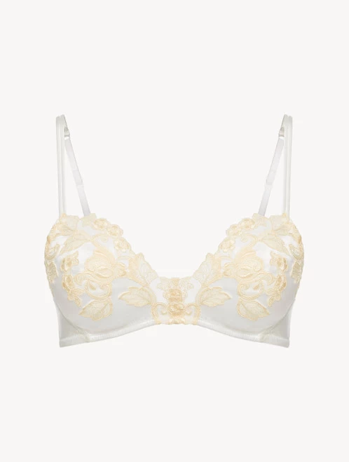 The iconic Maison collection embodies La Perla’s dedication to fine Italian craftsmanship and the most precious materials. This elegant bra features embroidered motifs on a tulle background, hand finished with a double-frastaglio technique, which reproduces the effect of flowers framing the décolleté. A modern yet elegant creation that represents the newest and most exquisite style in the Maison collection. The non-wired construction and soft cups ensure an irresistibly comfortable fit.