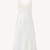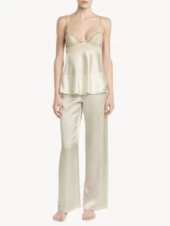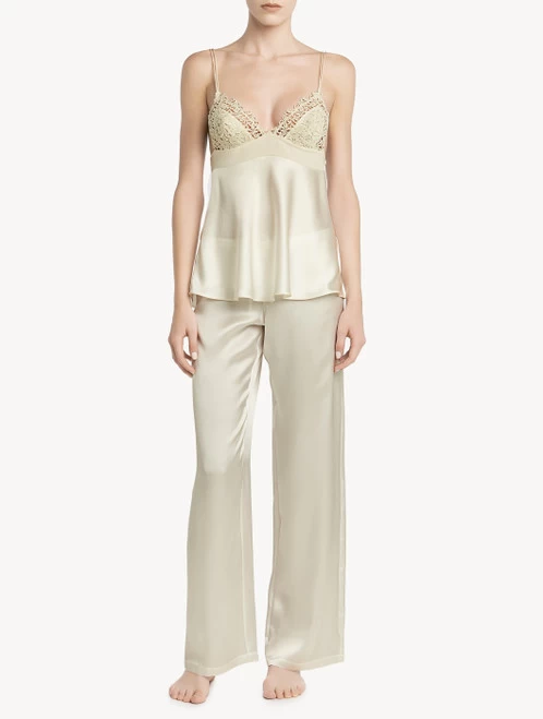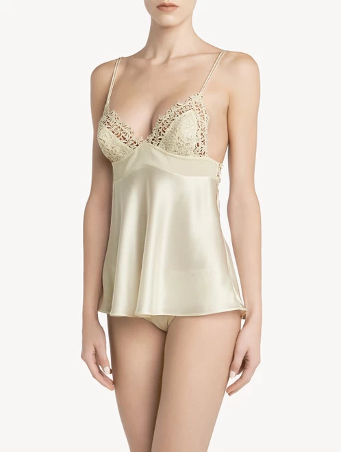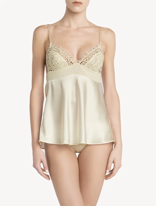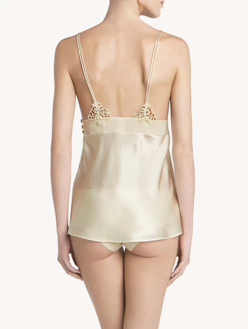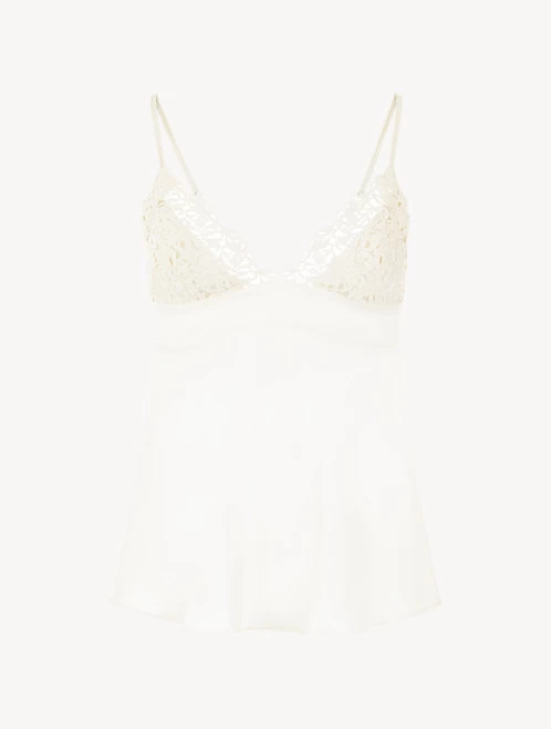 Camisole in pure silk satin embellished with refined macramé frastaglio appliqué. Details in stretch silk organza.