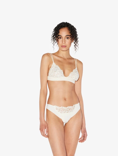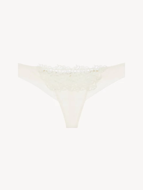 Thong in ultra-light Lycra® embellished with refined macramé frastaglio appliqué.