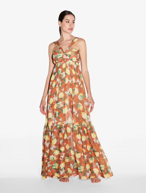 Capturing the irresistible mood of an Italian summer, the Amalfi Twist Maxi Dress in orange features a fresh and vibrant print of lemons and flowers. Cut to a timeless and flattering silhouette, it’s finished with contemporary, cut-out detailing and halterneck ties. Designed with versatile dressing in mind, wear as an effortless cover-up over your striking swimwear or style with sandals or heels for perfectly elegant day-to-night style.