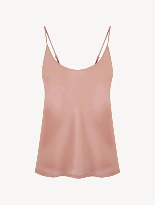 Perfect for warm nights, this silk satin pajama top features thin, adjustable shoulder straps and a cool, comfortable feel. Its body-skimming shape, powder pink hue and subtle lustre create a delicate, feminine mood. A scooped neckline flashes the décolletage for a sensual finish. Complete the set with matching silk shorts.