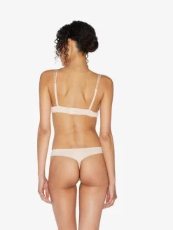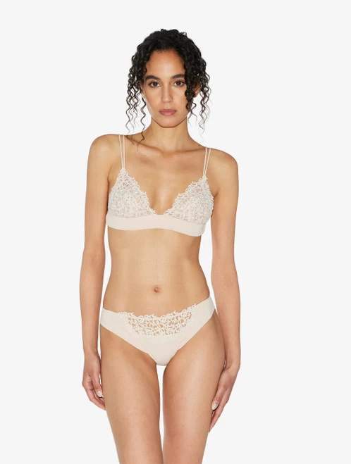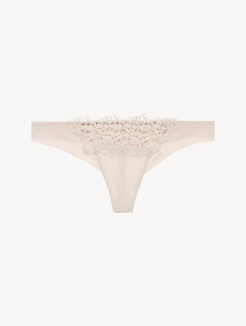 Thong in ultra-light Lycra® embellished with refined macramé frastaglio appliqué. Made in Italy.