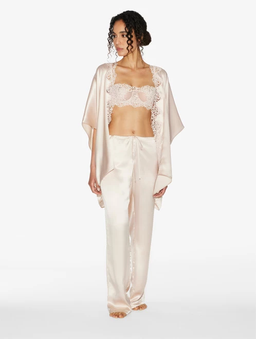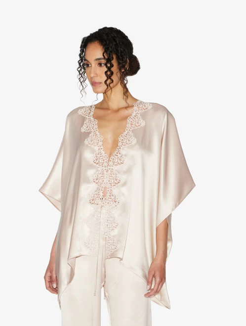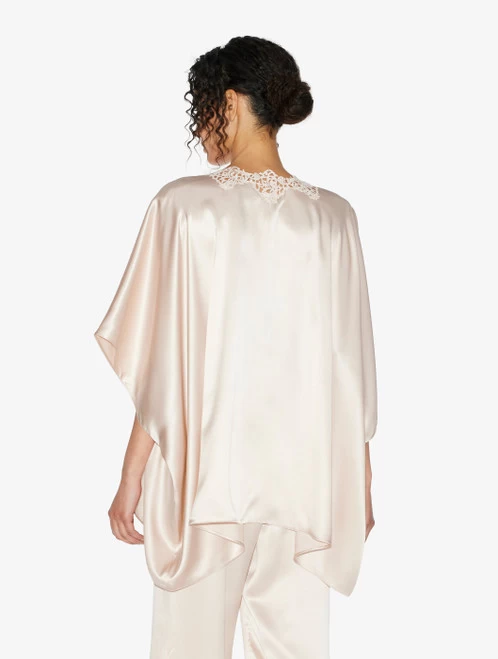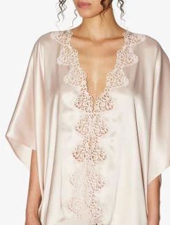 Wide night robe in pure silk satin embellished with refined macramé frastaglio appliqué. Made in Italy.
