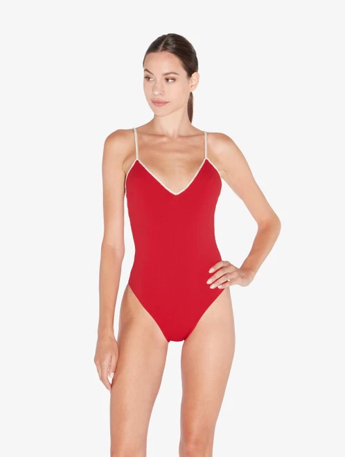 Blending elegant sophistication with a modern nautical spirit, the La Perla Signature Swimsuit in red is elevated with the iconic LP monogram in a tonal, stretch jacquard. Cut to a chic, contemporary silhouette with a daring V-neck, it’s finished with contrasting cordonette straps for timeless resort style. Complete the look with the co-ordinating Jumpsuit or Polo Dress.