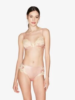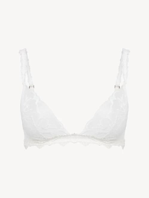 Capturing a mood of sensual sophistication, the romantic Note Bianche collection blends modern silhouettes with precious details. Meticulously crafted from the delicate motifs of Leavers lace and finished with guipure embroidery, the Soft Triangle bra in a luminous shade of Off White is wireless for luxurious comfort and elevated with silk straps and a plunging shape. Pair with the co-ordinating Brazilian Brief or Thong to elegantly underpin your day-to-night wardrobe.