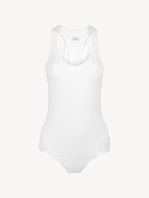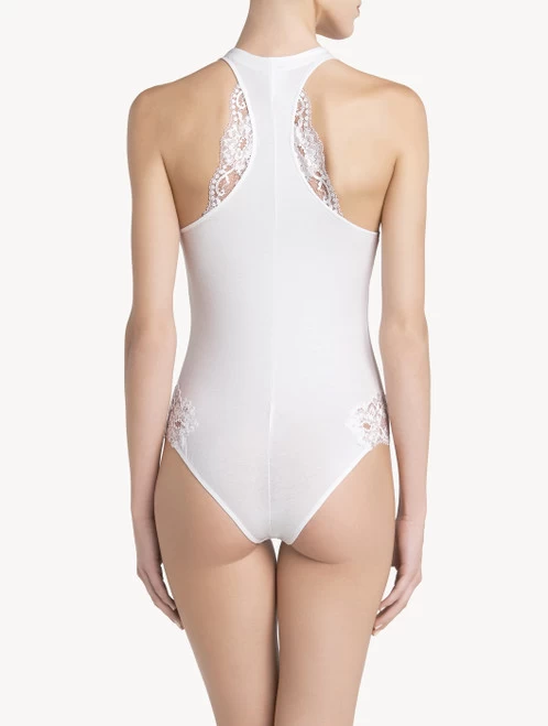 This bodysuit is made from comfortable stretch, cotton jersey that feels sumptuous against bare skin. The elegant Leavers lace design on the back is a luxurious touch elevating this item from undergarment to statement piece.