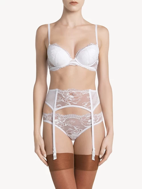 This suspender belt has been expertly crafted from stretch Leavers lace and tulle. A statement piece that pairs perfectly with the matching bra and brief set from the same collection.